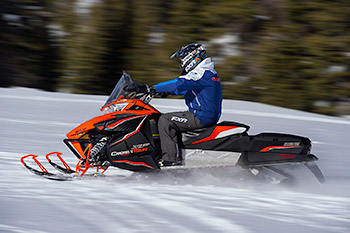 Radical side-hilling and extreme vertical climbs are not recommended, but boondocking in powder meadows and traipsing through ungroomed accesses can be performed with confidence. Definitely, the extreme track length and exquisite balance of this sled enables it to perform well off-trail – with limits.