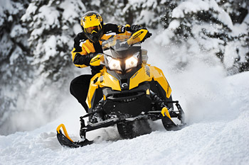 The difference here is a very similar setup being used on the front end of, not a touring snowmobile, but a performance sled.