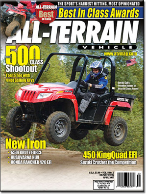 You’ll also read about Suzuki’s new 450 KingQuad EFI and get the scoop on our 500 class shootout where we put 4 of the top players in this popular category to the test.