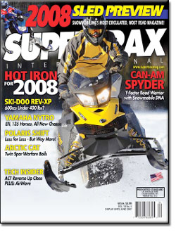 This issue features your first look at all the new iron for 2008 like the REV XP, Yamaha Nytro, Polaris Shift and the latest Cats. Also get your schooling on ACT Reverse and get a first hand look at Can-Am’s ground-breaking Spyder.