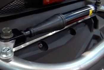 Amazingly, this is a conventional shock that is bolted to the frame of a snowmobile, usually under the hood, and it is designed to get rid of harmonic vibration and miniscule chassis movements due to flexing as the sled is being ridden. Total movement of the shock is measured in microns, so it’s very difficult to monitor the shock’s action with the naked eye.