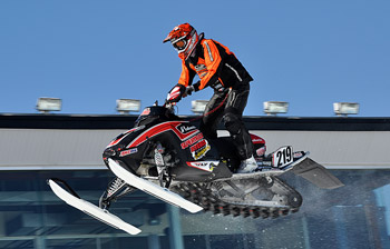 Jamie was passed in corner 2 but stayed on the throttle down the front stretch, diving to the inside of the starting line corner, making a great clean pass for the lead and the win. In Moto 2, Jamie was 2nd and he and the leader were pulling away from the rest of the pack. Jamie overshot the finish line triple, got crossed up in the air and came off the side of the sled on the landing.