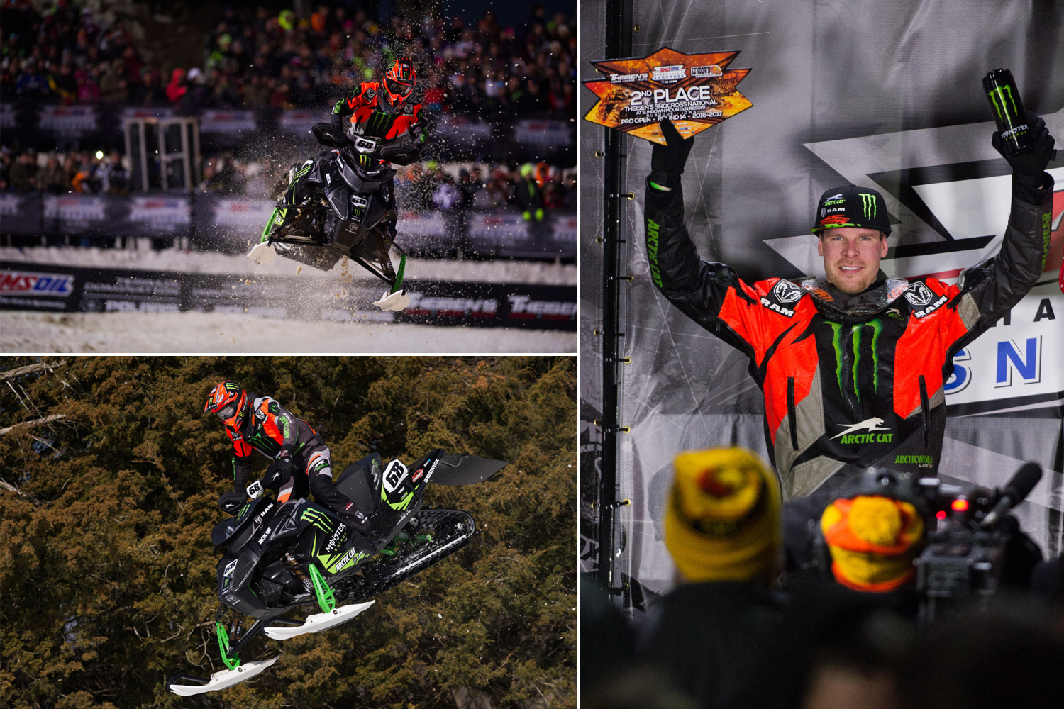 Monster Energy / Arctic Cat / Ram Truck’s Tucker Hibbert scored a podium finish at the penultimate event of the 2016/2017 ISOC National Snocross tour in Dubuque, Iowa. Marking the first time the national tour has landed in The Hawkeye State, the Iowa Snocross National featured a steep, rough track on a tight section of Sundown Mountain Resort’s ski hill.