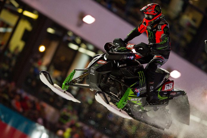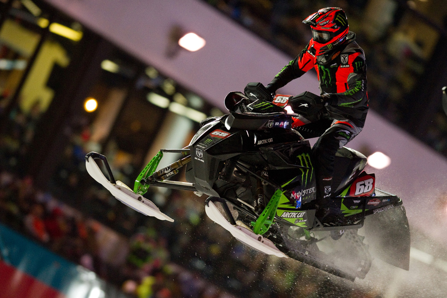 Sunday afternoon, Monster Energy / Arctic Cat / Ram Truck’s Tucker Hibbert won the ISOC National Snocross Canterbury Park Pro Open final in Shakopee, Minn.