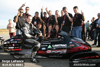 ISR (International Snowmobile Racing) and SCM (Super Compétition Motorisée ) officials were present to confirm the speed record with the chronometer and land markers at mid track.