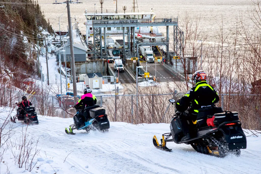 All of this is possible because safe river crossings are an integrated part of the Grand St. Lawrence Snowmobile Tour. At its west end, this loop includes an enclosed snowmobile shuttle across the bridge between Lévis (south side) and Quebec City (north side). 535km (465mi) farther east, the widest crossing is via the winter ferry running 61km (38mi) between Baie-Comeau and Matane. In between, the Grand St. Lawrence Snowmobile Tour also includes a short ferry ride across the Saguenay River from Baie-Sainte-Catherine in the Charlevoix Region to Tadoussac in the Cote-Nord Region (see river crossing sidebar for more info).
